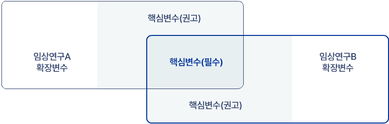 • 개별 임상연구에서 해당 질환(주제)의 연구를 위해 핵심 변수에 추가하여 공통적으로 수집하는 변수